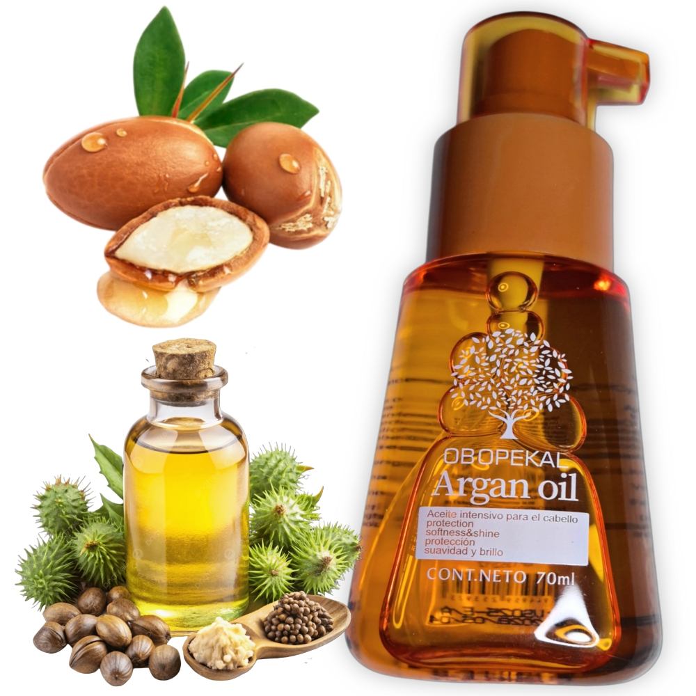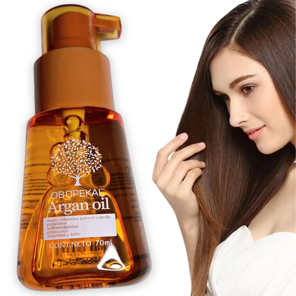 Aceite de Argan Obopekal 70 ml. Este aceite está formulado para fortalecer el cabello, reducir el encrespamiento, reparar y prevenir las puntas abiertas. Además aporta una hidratación profunda y un brillo natural, dejando el cabello sedoso al tacto con ingredienttes activos como el Isododecano mineral, dimeticonol y el ciclopentasixolano.