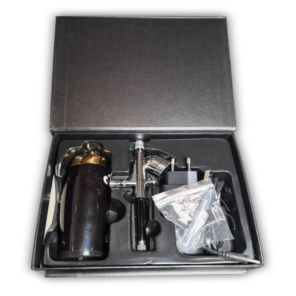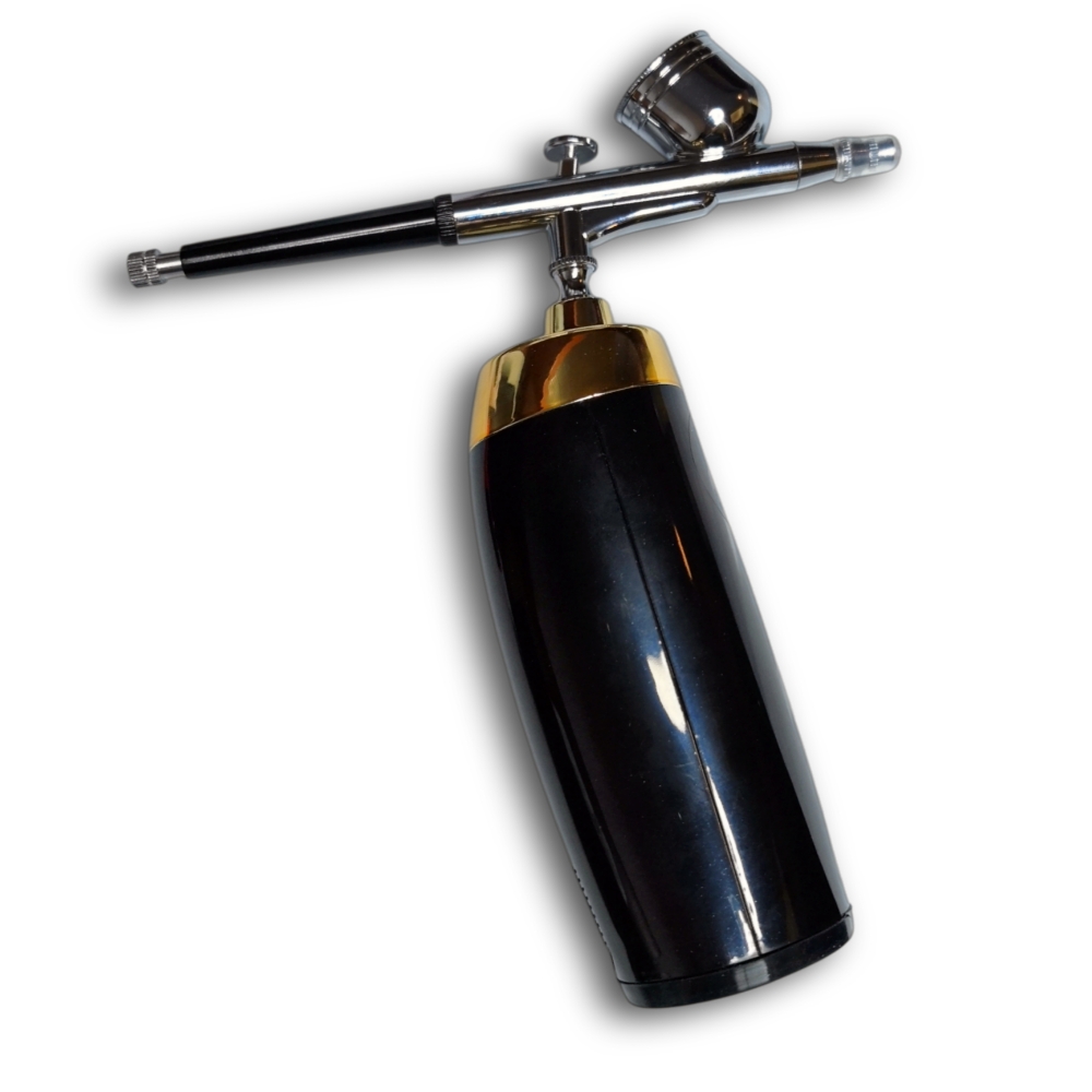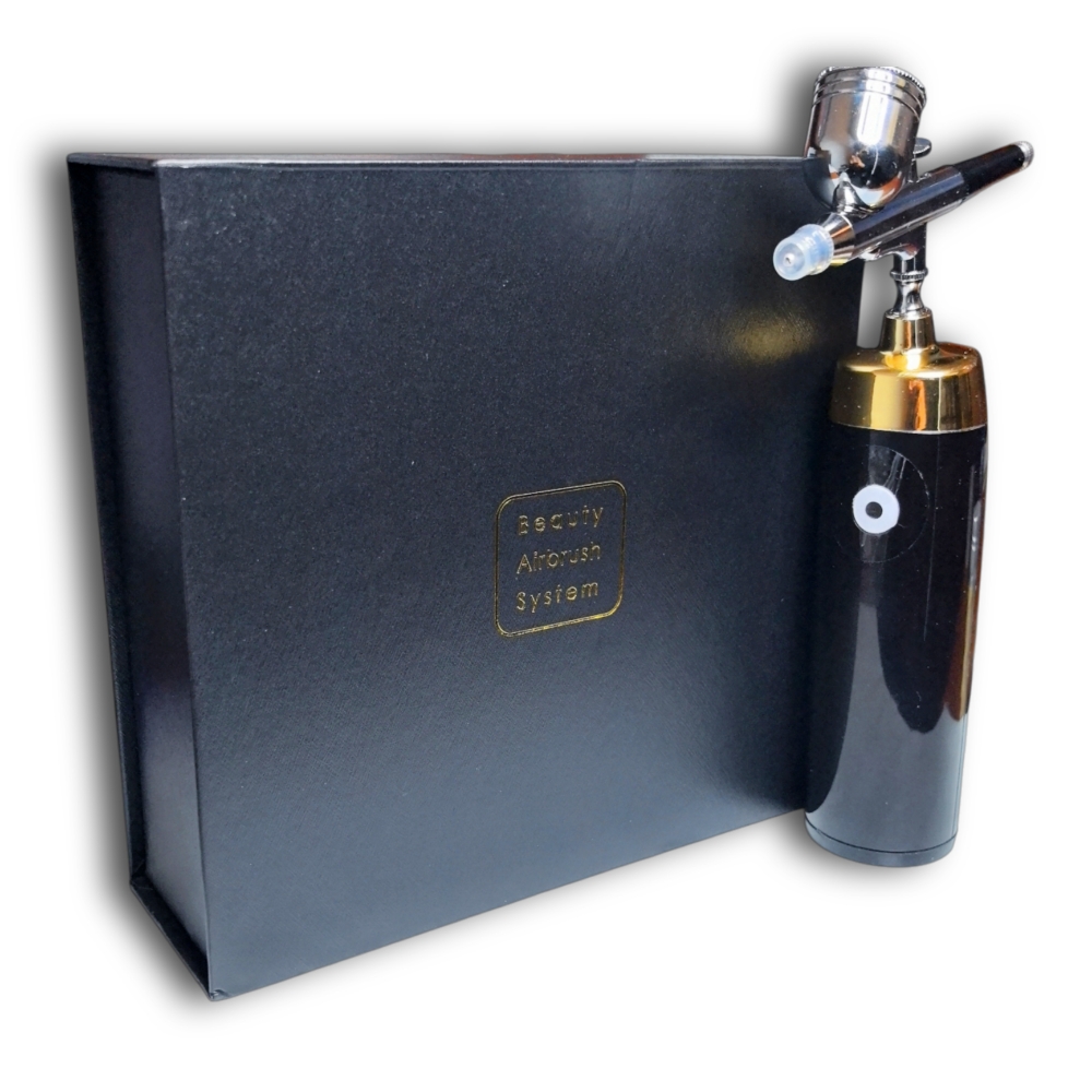 Aerógrafo para salones de belleza. Aplica maquillaje u otros productos en la piel usando un flujo de aire fino, en lugar de pinceles o esponjas.