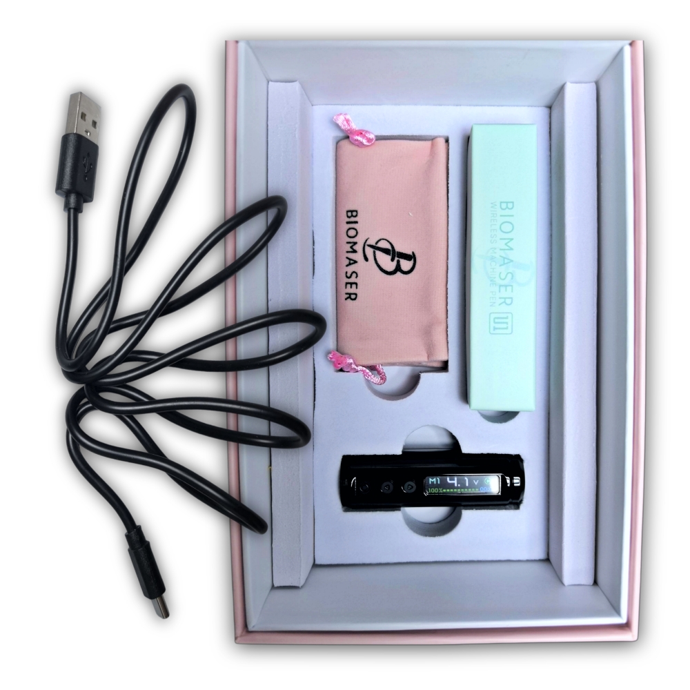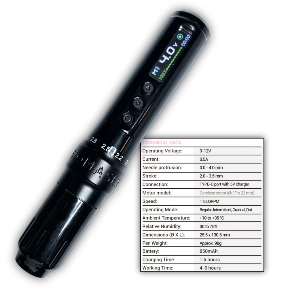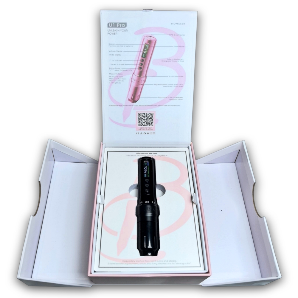 Dermografo Biomaser U1 Pro. Es una herramienta profesional diseñada para artistas de maquillaje permanente y tatuajes. Es inalámbrica con un diseño ergonómico, utiliza un motor silencioso y es compatible con cartuchos rotativos universales, incluye dos baterias recargables que alcanzan hasta 12 horas de operación, tiene un voltaje de operación de 3-12 V, Stroke de 2 – 3.5 mm. Tiempo de carga de cada batería de 1.5 horas, pesa 98 gramos aprox. La pantalla muestra cronómetro, porcentaje de carja, voltaje, modo de operación (opera de 4 modos diferentes)…
