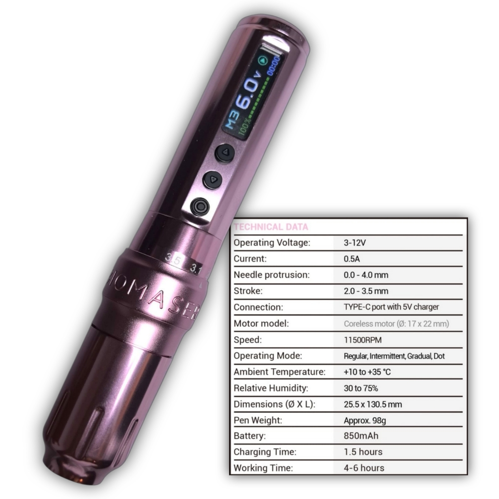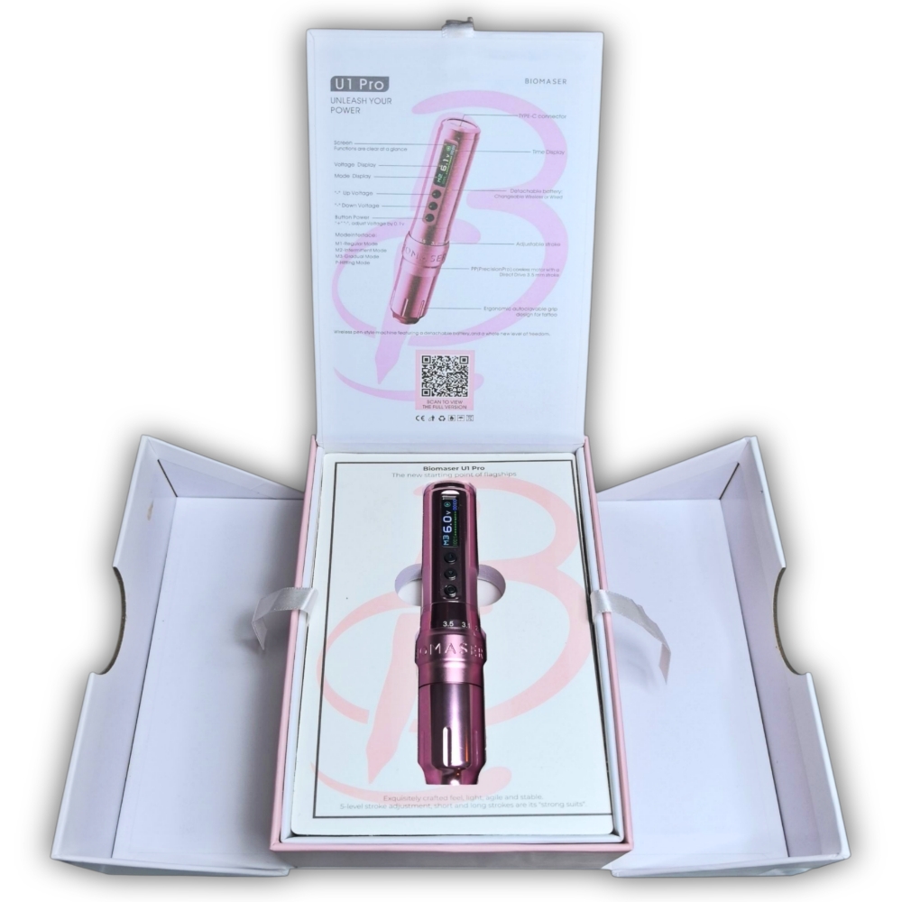 Dermografo Biomaser U1 Pro. Es una herramienta profesional diseñada para artistas de maquillaje permanente y tatuajes. Es inalámbrica con un diseño ergonómico, utiliza un motor silencioso y es compatible con cartuchos rotativos universales, incluye dos baterias recargables que alcanzan hasta 12 horas de operación, tiene un voltaje de operación de 3-12 V, Stroke de 2 – 3.5 mm. Tiempo de carga de cada batería de 1.5 horas, pesa 98 gramos aprox. La pantalla muestra cronómetro, porcentaje de carja, voltaje, modo de operación (opera de 4 modos diferentes)…
