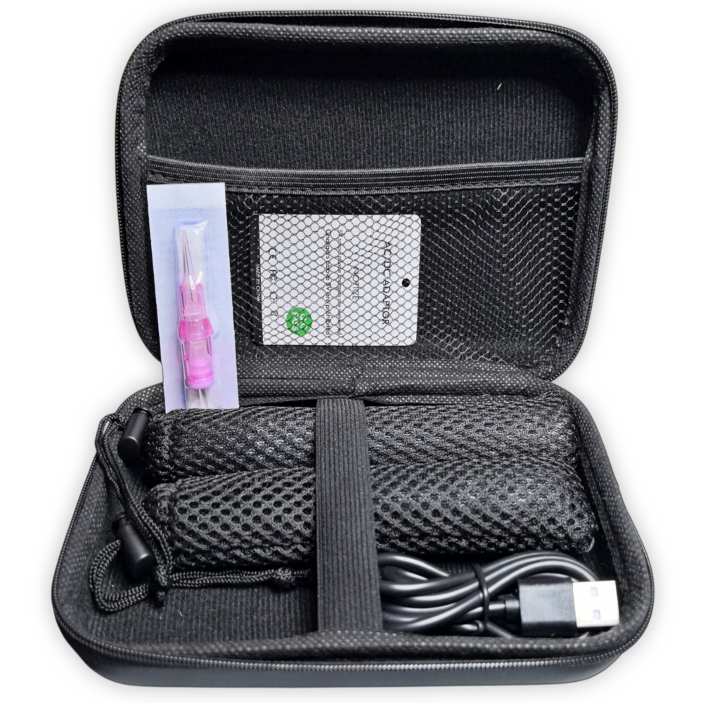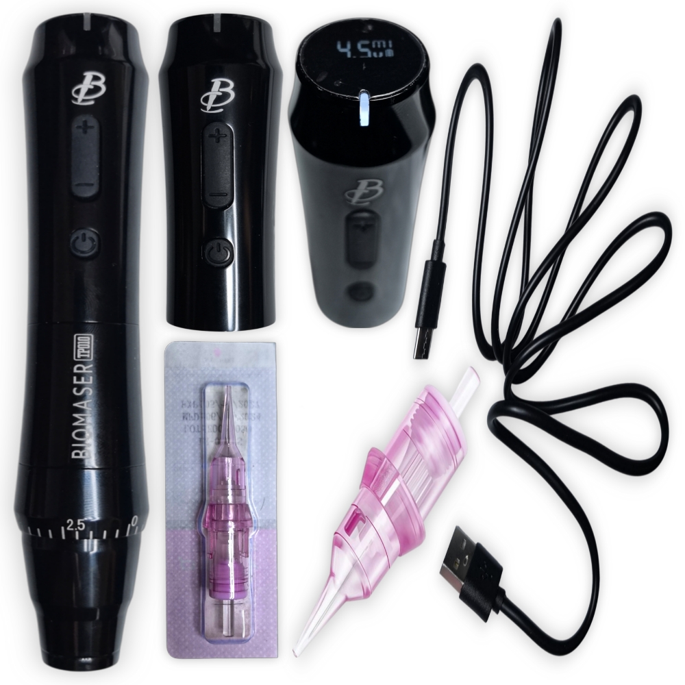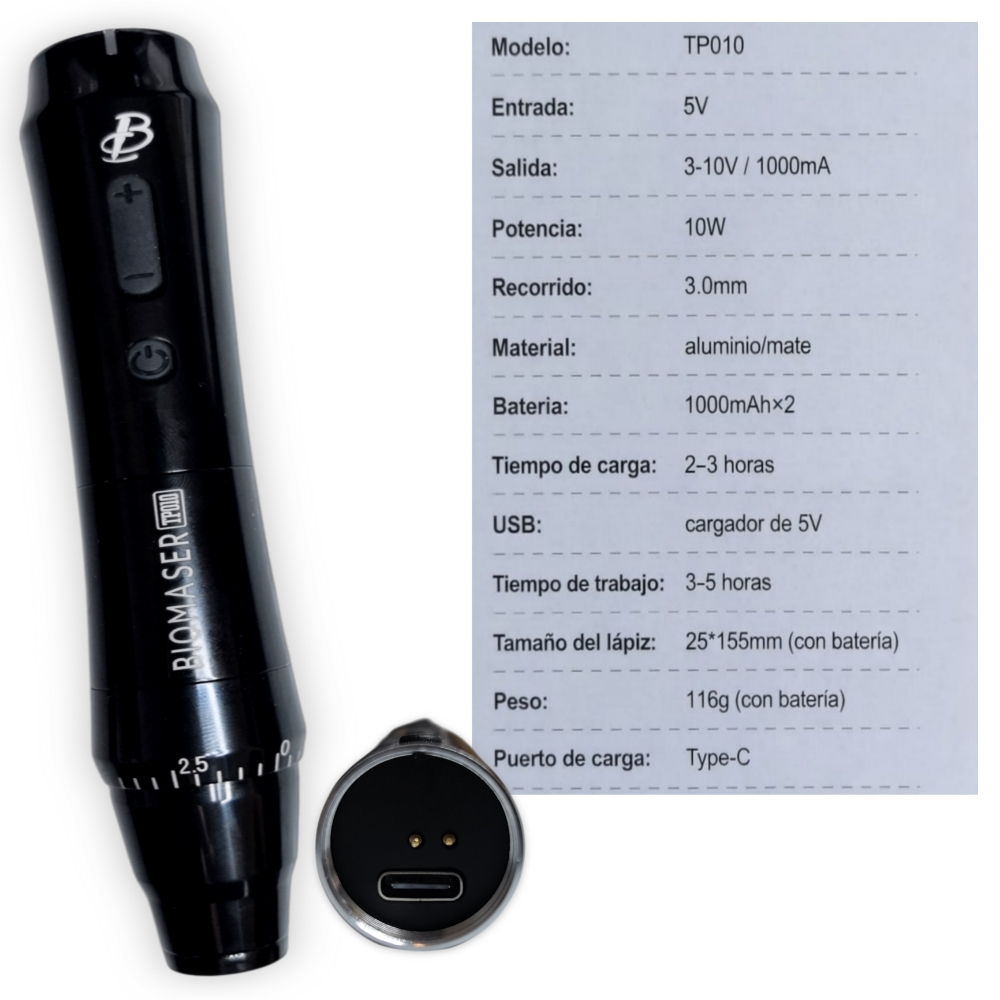 Dermografo Inalámbrico Digital, TP010 de Biomaser, con dos baterías de 1000 MA, duración de trabajo de cada batería hasta 5 horas, 3 rotaciones diferentes de las agujas, para resultados optimos según técnica aplicada. Opera con agujas de alta Precisíon, las mismas agujas del P90. Duración de carga de la batería de 2 a 3 horas, Baja Vibración