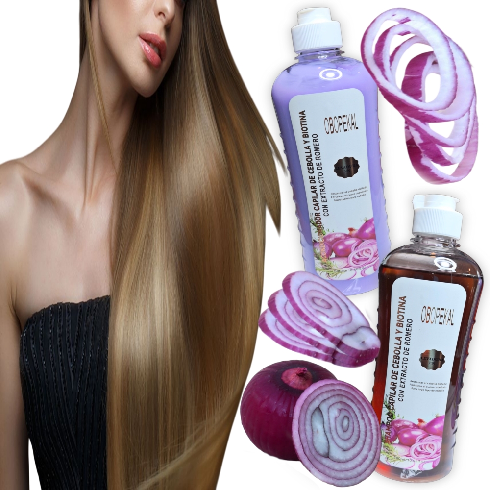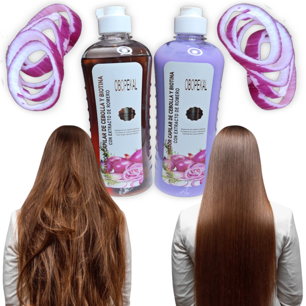 Kit Capilar Obopekal de Shampoo y Acondicionador de Cebolla y Biotina. El shampu está formulado para evitar la caida del cabello, limpiar profundamente sin resecar, activando la circulación del cuero cabelludo. El acondicionador complementa el tratamiento aportando hidratación intensa, suavidad y brillo, además de facilitar el desenredado. La combinacióon de cebolla y biotina refuerza la fibra capilar, reduciendo el quiebre y promoviendo la vitalidad del mismo.