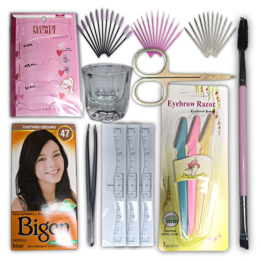 Kit de Cejas Semipermanentes Básico, con Bigen, el mismo incluye un tinte bigen con color a elección (26, 45, 46, 47, 48, 56, 57, 58 y 59) – 1 Dappen + 1 pincel + 10 cepillos + 12 microbrush + 12 palos de naranjo + 3 cintas métricas para cejas + 1 tijera de cejas + 1 pinza para cejas + 3 perfiladores para cejas + 3 moldes para cejas