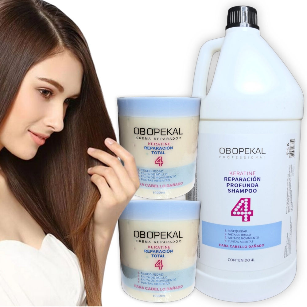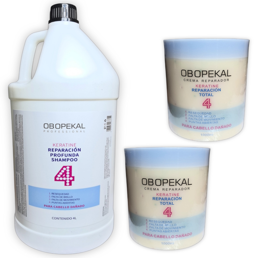 Kit de Shampú de Reparación Profunda con Keratina 4L + 2 Cremas Reparadoras Obopekal 2 L. El shampú de reparación profunda está diseñado específicamente para el cabello dañado, seco o tratado químicamente, ofreciendo una solución profesional para salones de belleza o uso doméstico intensivo. Ataca cuatro problemas específicos del cabello: resequedad, falta de brillo, falta de movimiento y puntos abiertos. Su fórmula ayuda a restaurar y fortalecer la fibra capilar desde la raíz hasta las puntas. Limpia profundamentte sin resecar, mejorando la manejabilidad y suavilidad del cabello. La crema reparadora está diseñada para cabellos dañados o tratados químicamente. Su formula enriquecida con keratina actúa fortificando la estructura interna de la cutícula para prevenir futuros quiebres. Incluyendo 2 unidades de 1 L c/u.