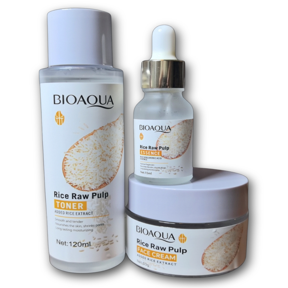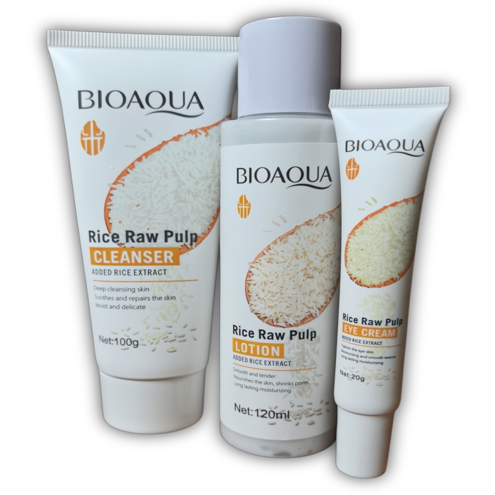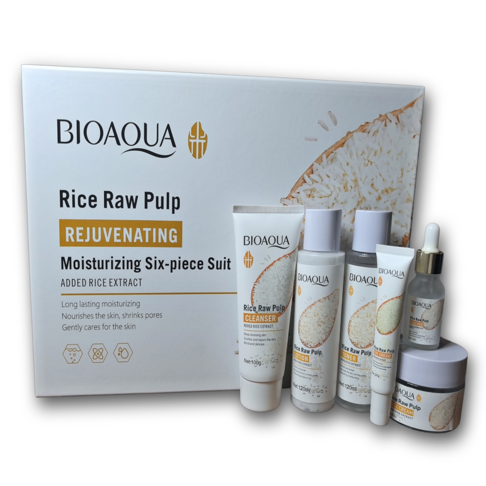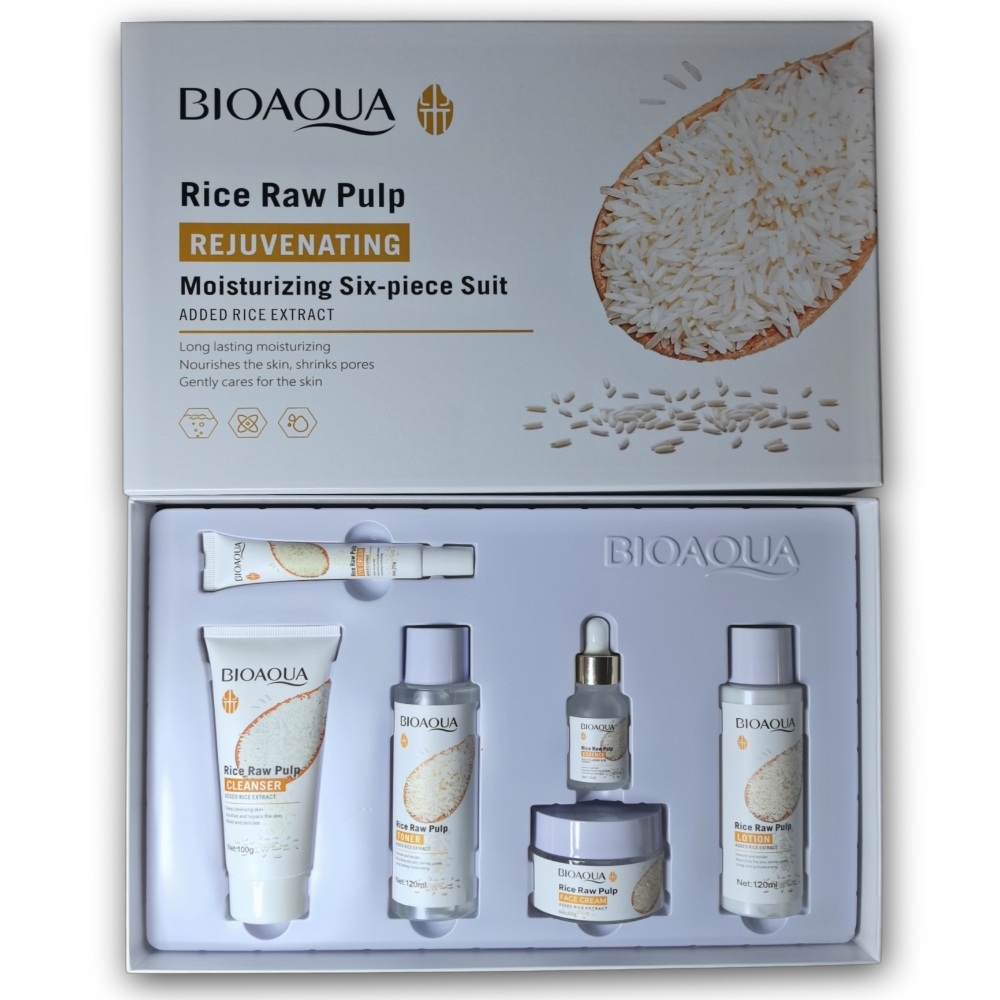 Set para el cuidado facial de 6 piezas a base de extracto de pulpa de arroz BIOAQUA. El set contiene un limpiador facial, un tónico reparador, un suero facial antioxidante, una crema para el contorno de ojos, una crema hidratante facial y una loción facial de noche.