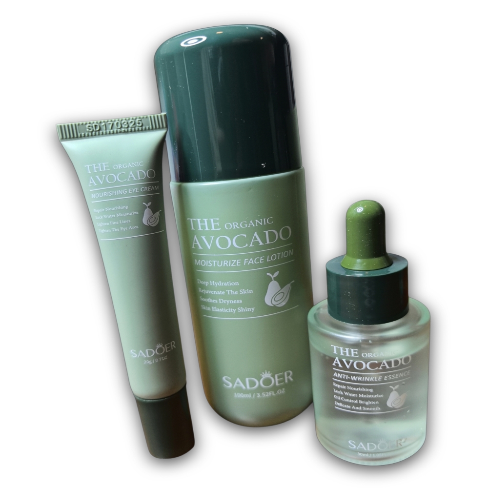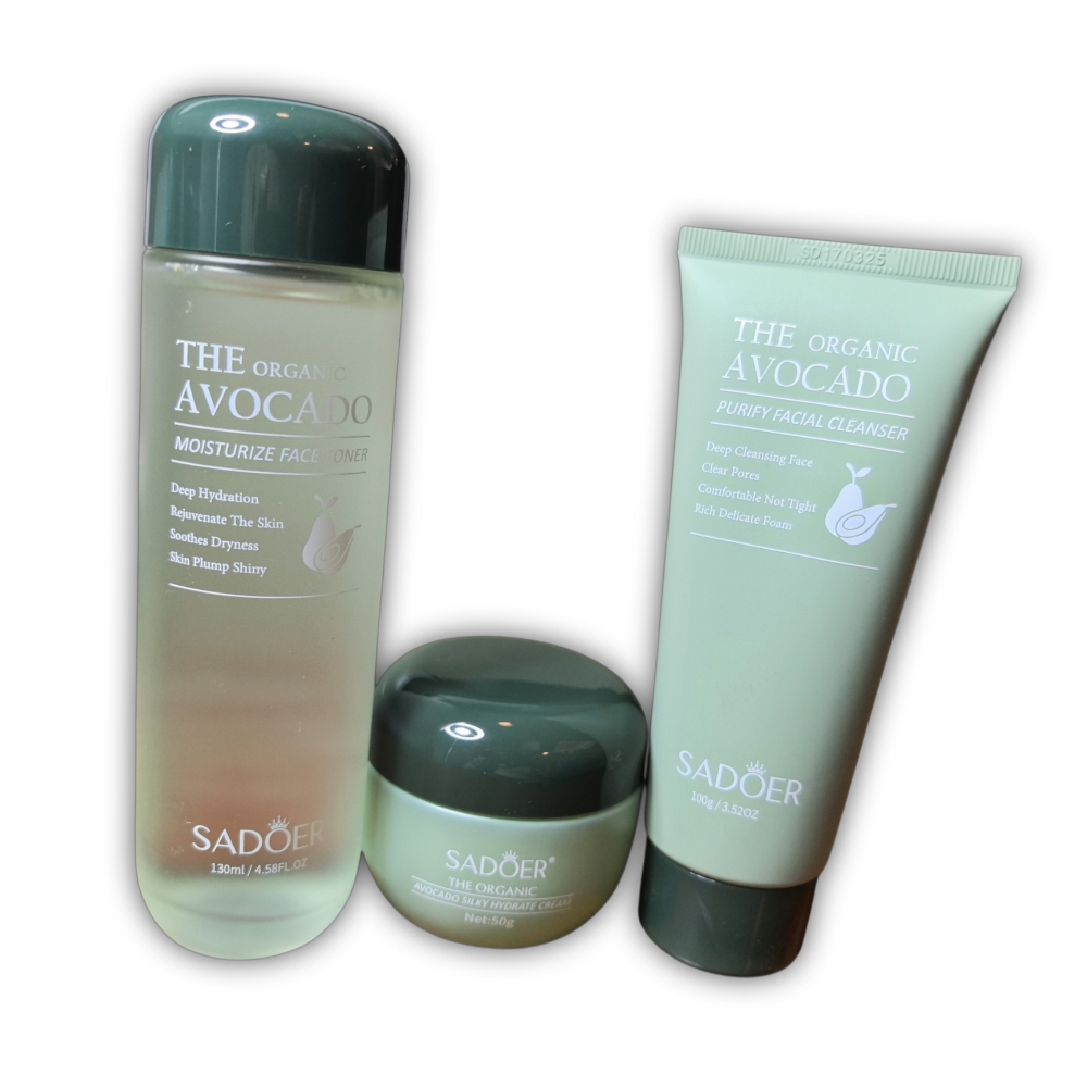 Set para el cuidado facial de 6 piezas a base de extracto de palta Sadoer. El set contiene un limpiador facial, un tónico, un suero facial antioxidante, una crema para el contorno de ojos, una crema hidratante facial y una loción facial de noche.