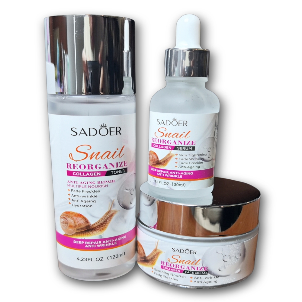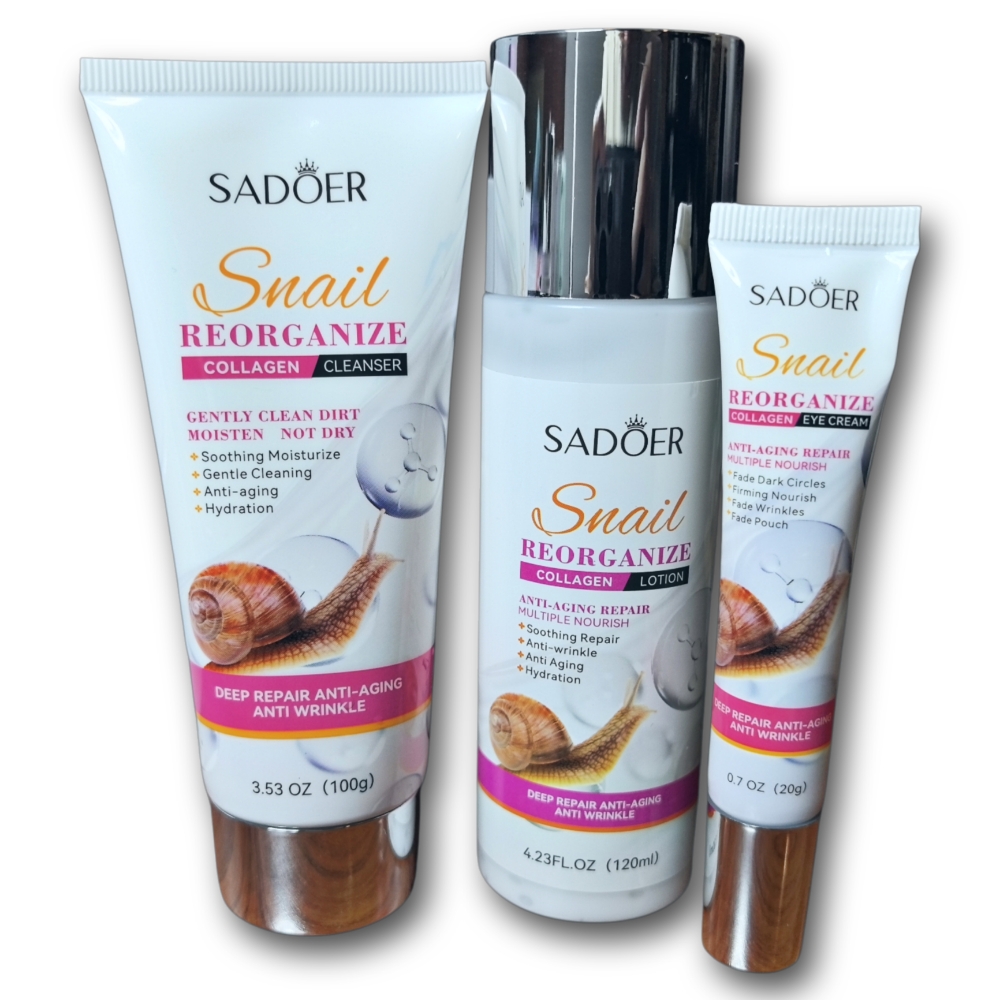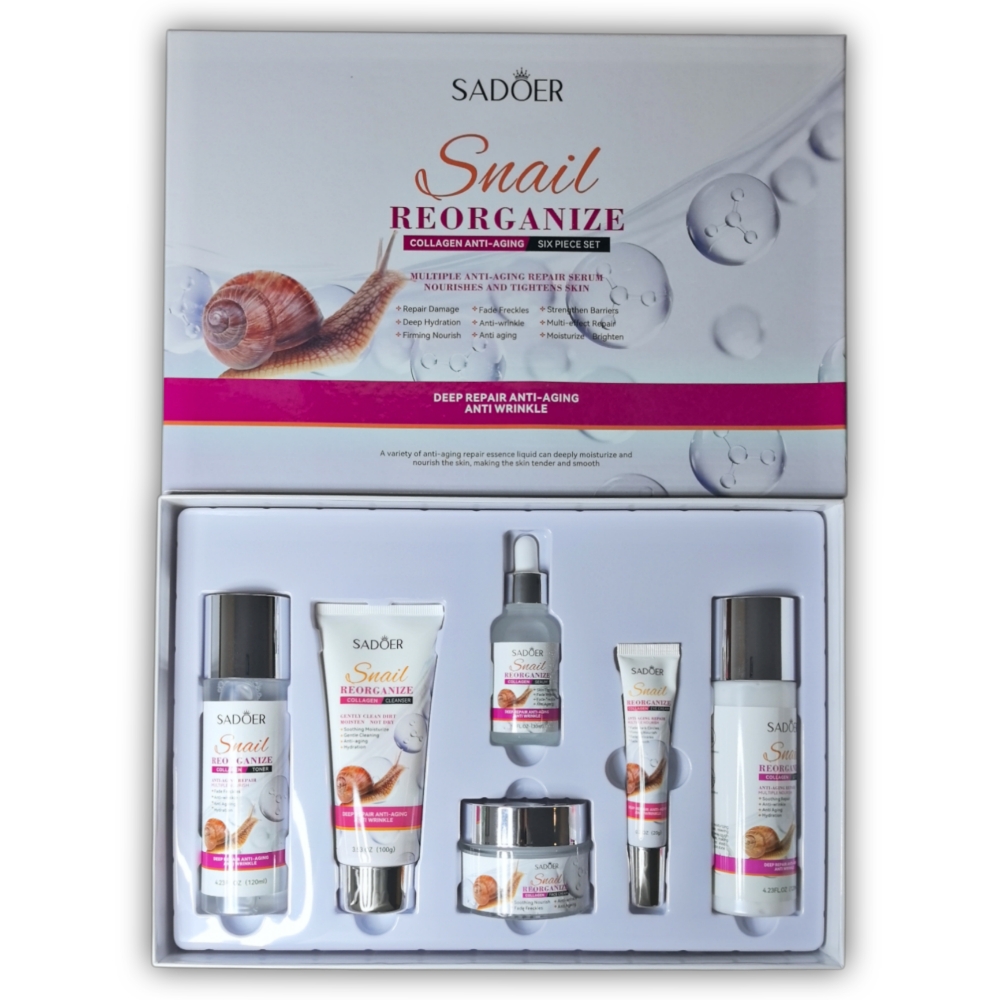 Set para el cuidado facial de 6 piezas reorganizador a base de colageno Sadoer. El set contiene un limpiador facial, un tónico reparador, un suero facial antioxidante, una crema para el contorno de ojos, una crema hidratante facial y una loción facial de noche.