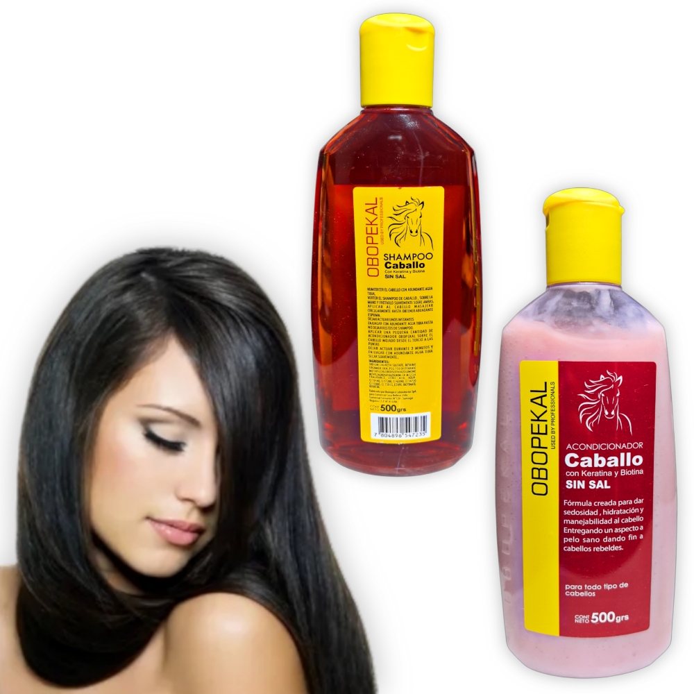 Kit para el cuidado de cabello Obopekal Cabello, Shampoo + Acondicionador + Aceite + Mascara Capilar. Los productos Obopekal Caballo son una linea de cuidado capilar diseñada para estimular el crecimiento del cabello, fortalecerlo, y proporcionarle brillo y manejabilidad. Están formulados con keratina y biotina y sin sal. Contiene emolientes acondicionadores y agentes de limpieza que proporcionan cuerpo, brillo y manejabilidaden el cabello. Su suave y fragante espuma proporciona una acción de limpieza que no elimina los aceites naturales y otorga un aspecto saludable.