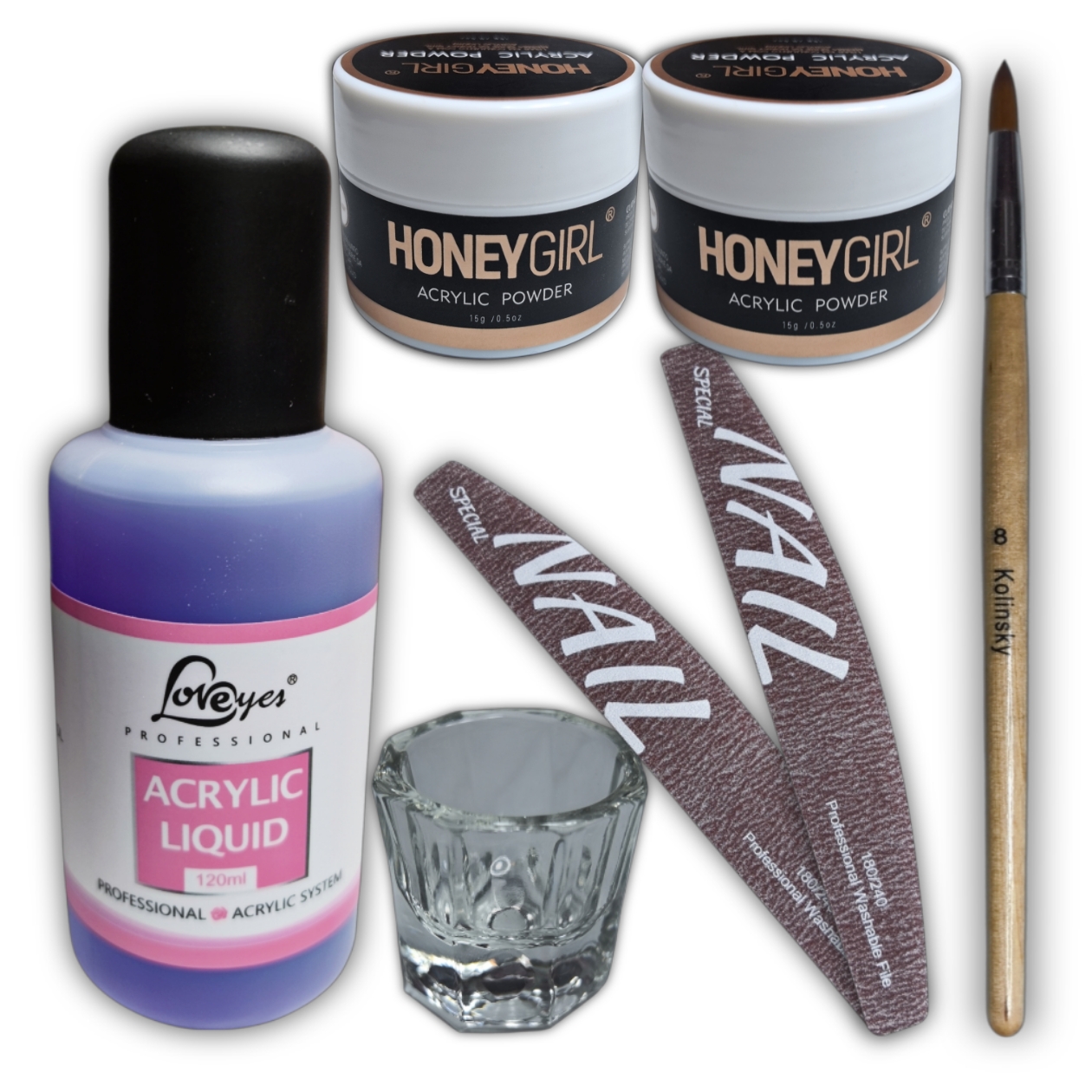 Kit para uñas acrílicas, incluye 2 polvos acrílicos de 15 gr cada uno, 1 monómero Loveyes de 120 ml, 1 dappen, 1 pincel y 2 limas 100/181