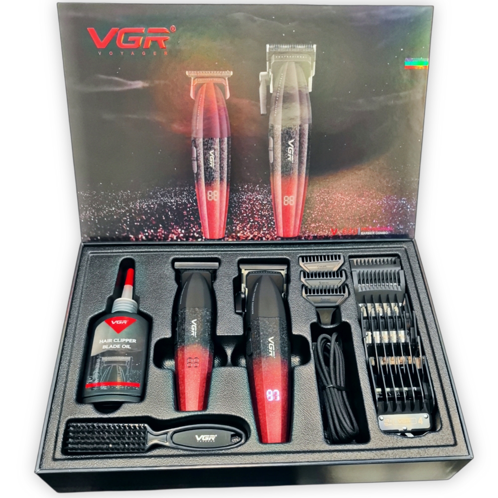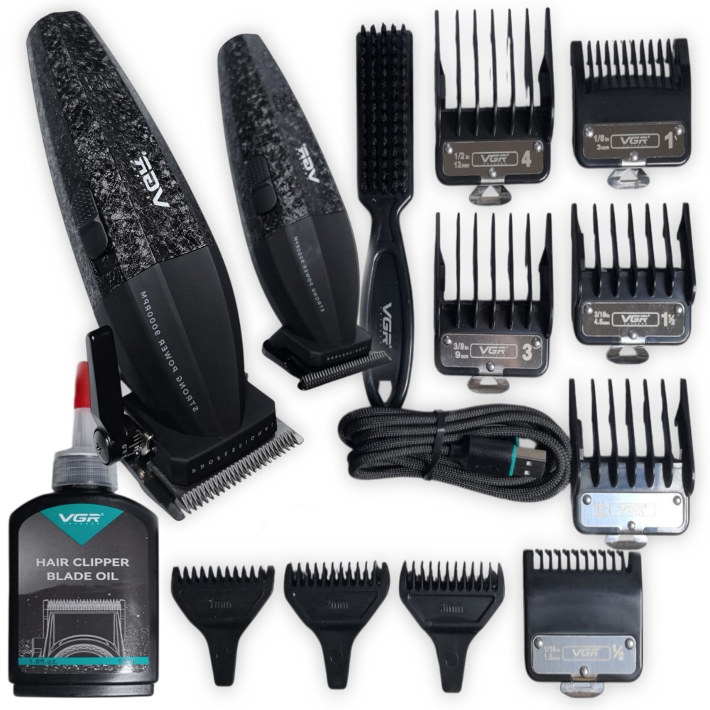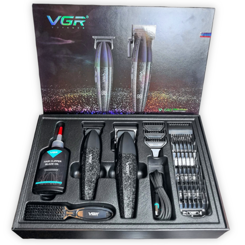 Kit profesional para barberia VGR V-640. Este incluye una máquina cortadora (clipper) y una máquina patillera (trimmer). Ambas máquinas están equipadas con un motor de alto rendimiento que alcanza las 9000 RPM, diseñado para cortes suaves y eficientes. Cuentan con baterías recargables de larga duración (2500mAh para la clipper y 2000 mAh para la trimmer), ofreciendo hasta 250 minutos y 240 minutos de uso continuo respectivamente. El paquete incluye: Peines guía (1mm, 2mm, 3mm, 4.5mm, 6mm, 9mm, 12mm), un cepillo de limpieza, aceite lubricante y un cargador tipo c.