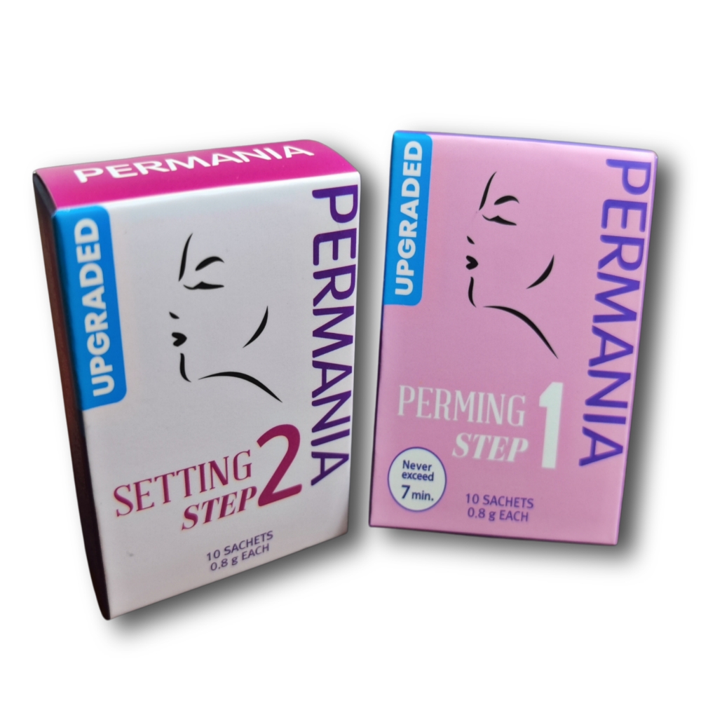 Kits para Lifting de Pestañas Permania, incluye pasos 1 y 2 con 10 sachets c/u de 0.8g , 10 pares de bigudiesen tallas diferentes (S,M, L) y 2 Y brush.