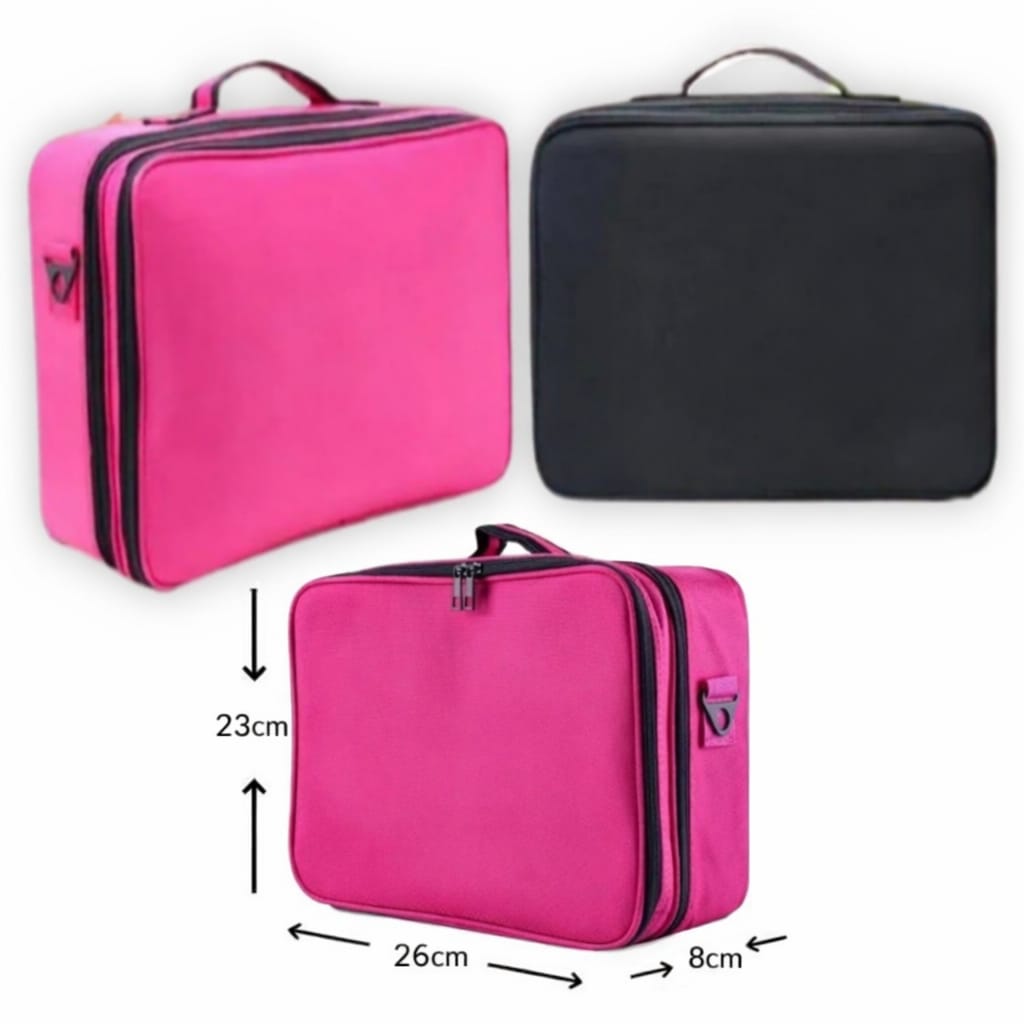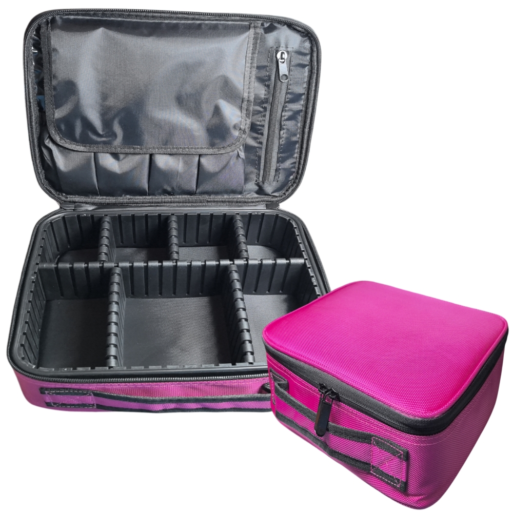 Estuche organizador de maquillaje y cosmeticos Rosado. Está diseñado con divisores ajustables para personalizar el espacio interior y organizar diversos productos y herramientas de belleza, como cosméticos, brochas y artículos de tocador.