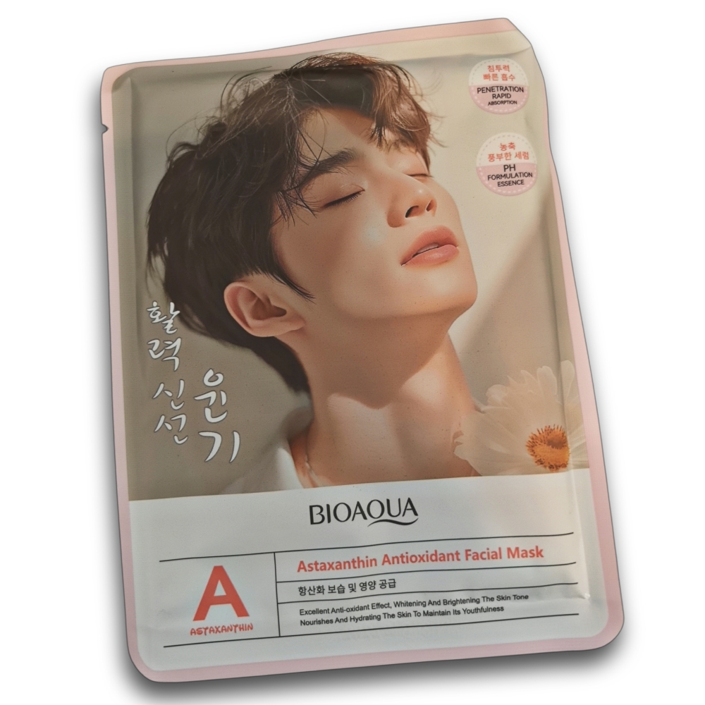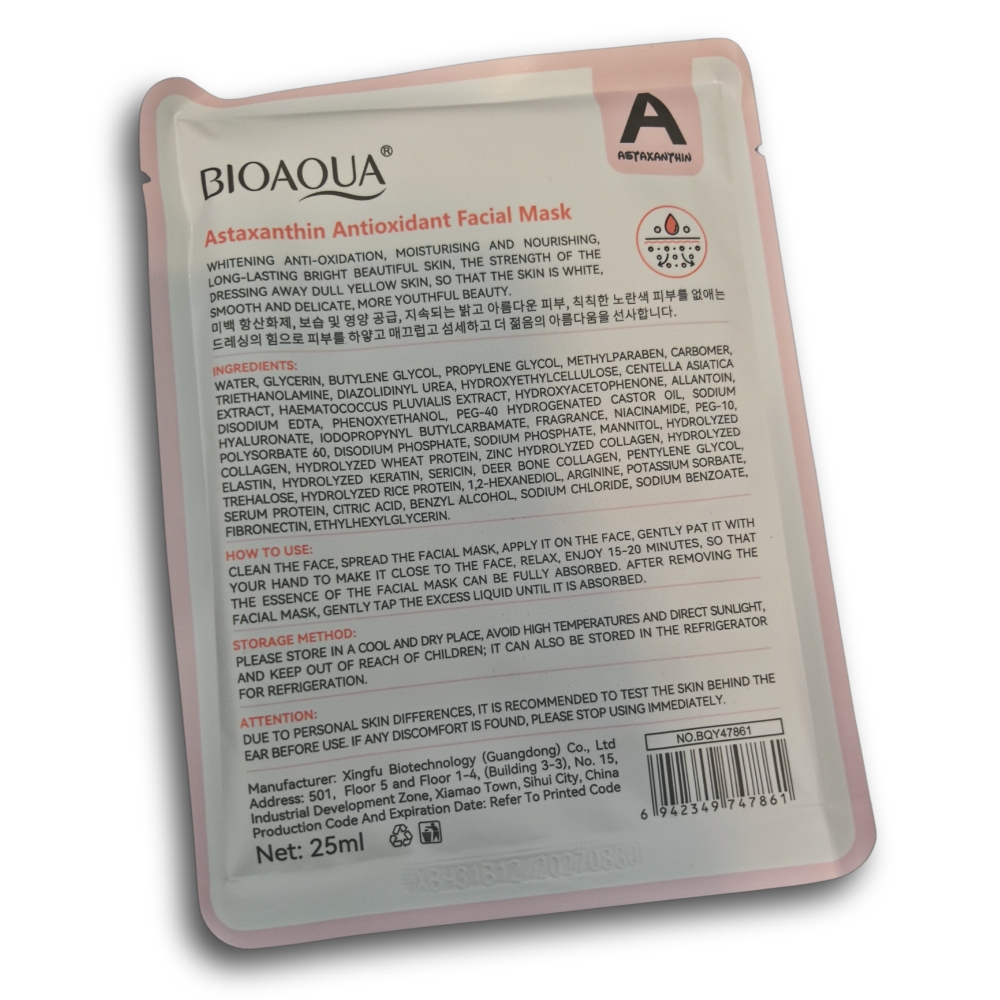 Mascarilla antioxidante de astaxantina, 10 sachets de 25 ml c/u. Reduce arrugas y lineas finas, ayuda a suavizar la piel y mejora la elasticidad y firmeza del tejido cutánea.