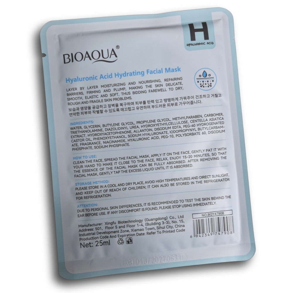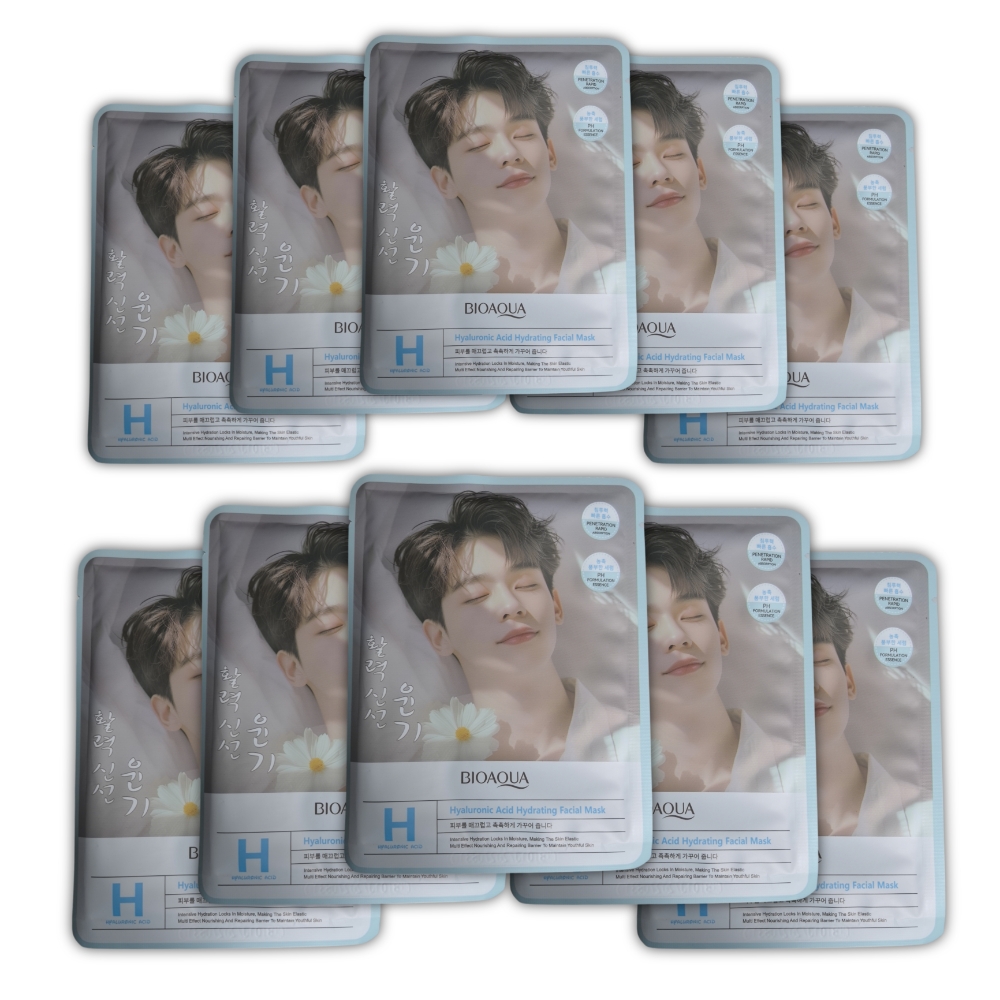 Mascarilla hidratante de acido híaluronico BIOAQUA, 10 sachets de 25 ml c/u. Proporciona hidratacion intensa, revitaliza la piel, mejora la elastacidad y promueve una tez radiante. Tambien ayuda a reponer la humedad, fortalecer la barrera cutanea y prevenir la sequedad.