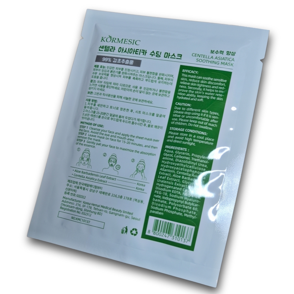 Mascarilla calmante KORMESIC, 10 sachets de 25ml c/u. Calma y repara la piel, hidrata profundamente, fortalece la barrera cutánea y regula el exceso de grasa.