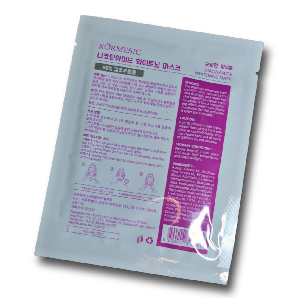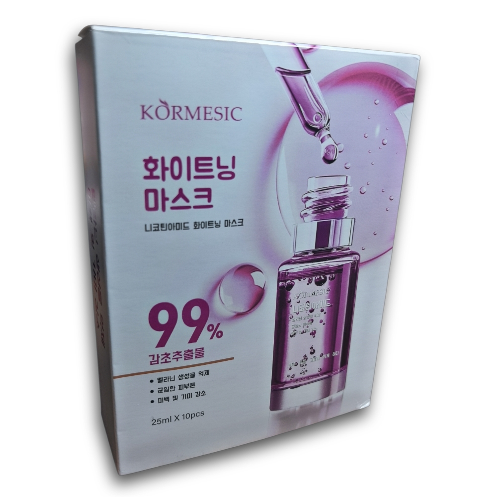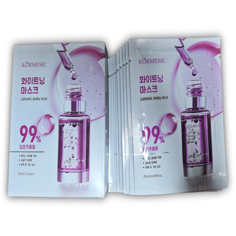 Mascarilla facial blanqueadora KORMESIC, 10 sachets de 25ml c/u. Ayuda a inhibir la producción de melanina, reduce las manchas de la piel y proporciona un tono de piel más uniforme y luminoso.