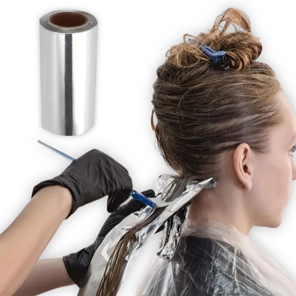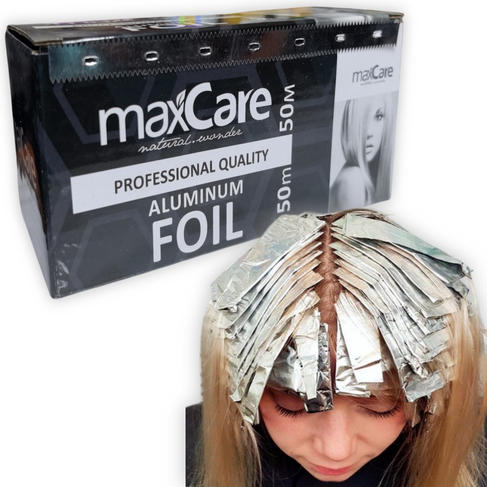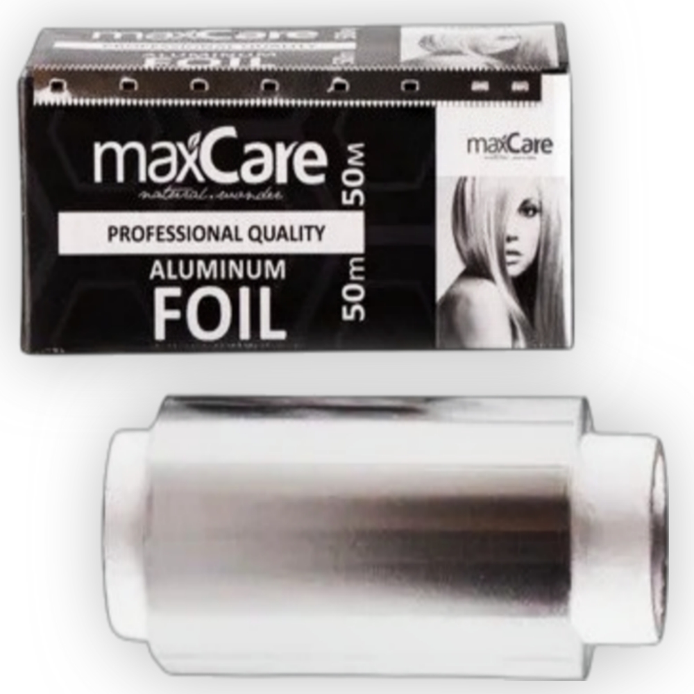 Papel de Aluminio profesional maxCare, 10cm x 50m. Este papel se utiliza comúnmente para técnicas de coloración y decoloración, como la creación de mechas, visos y balayage. Su función principal es facilitar la aplicación precisa del producto, mantener la estructura durante el proceso y ayudar a conservar la temperatura necesaria para que los químicos actúen correctamente en el cabello.