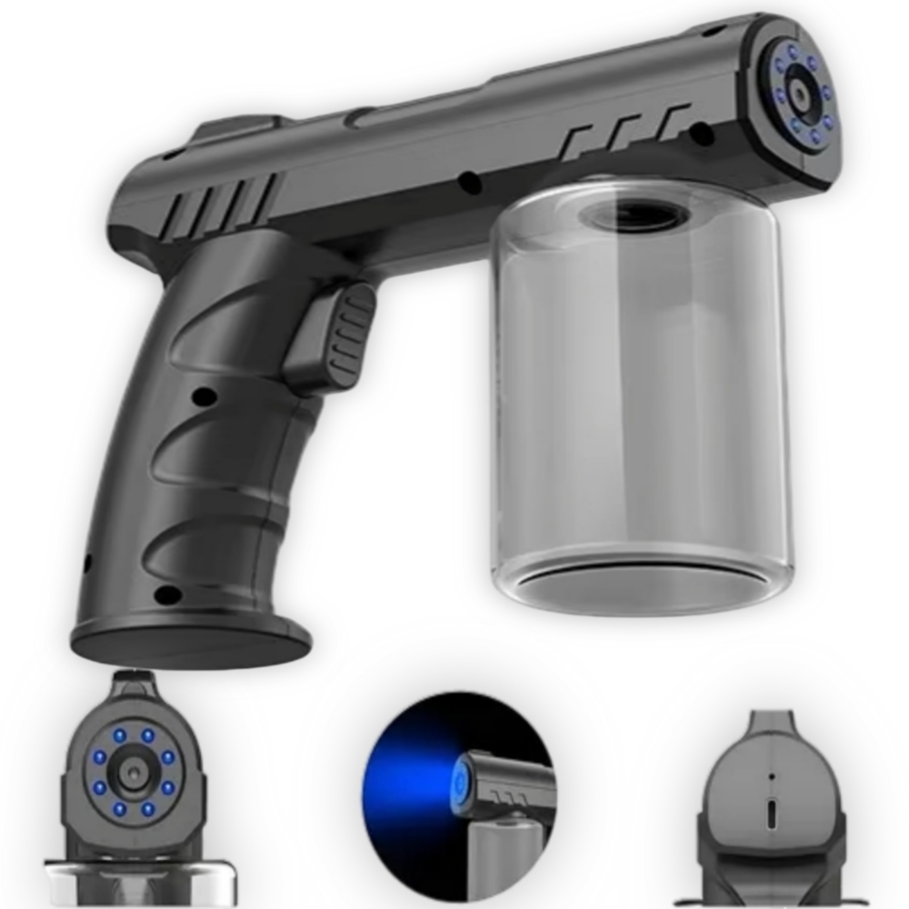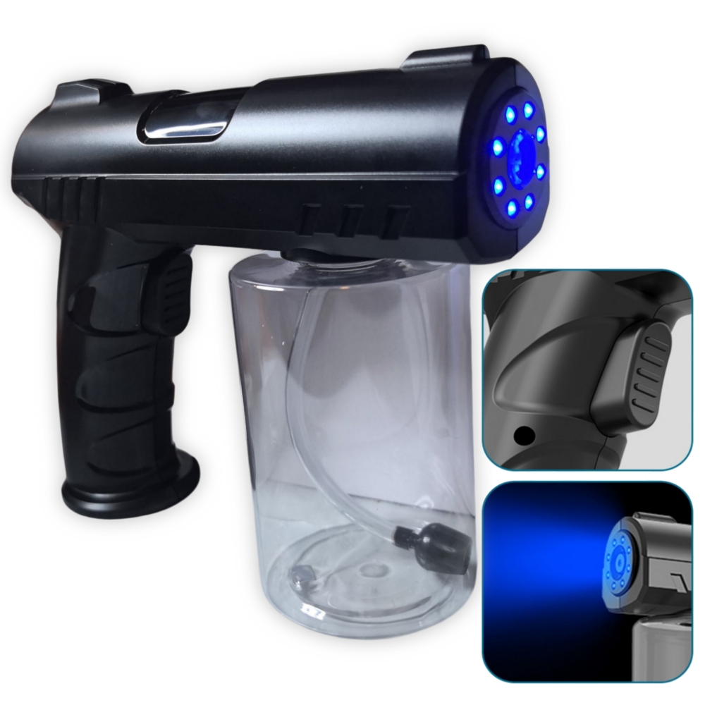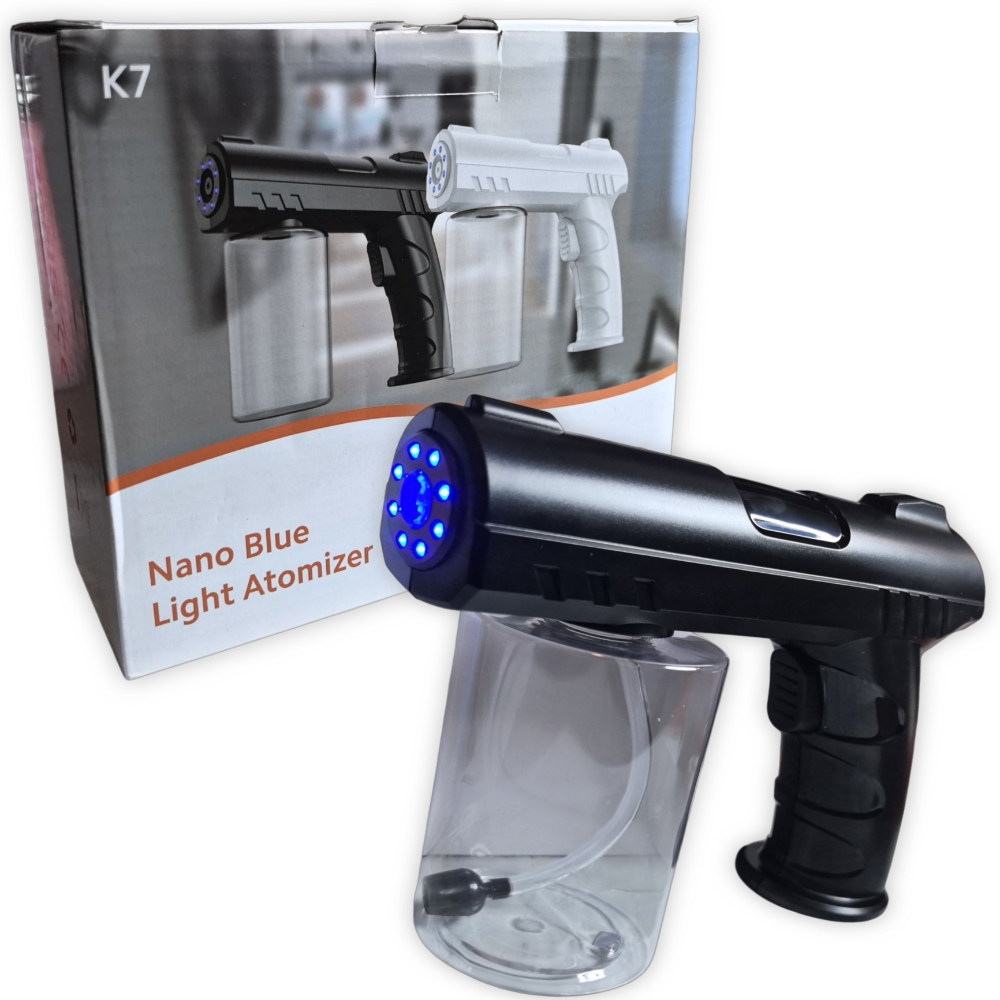 Pistola atomizadora K7 con luz azul UV. Este atomizador está diseñado para aplicar líquidos, como agua, lociones, productos para después de afeitado o desinfectantes.