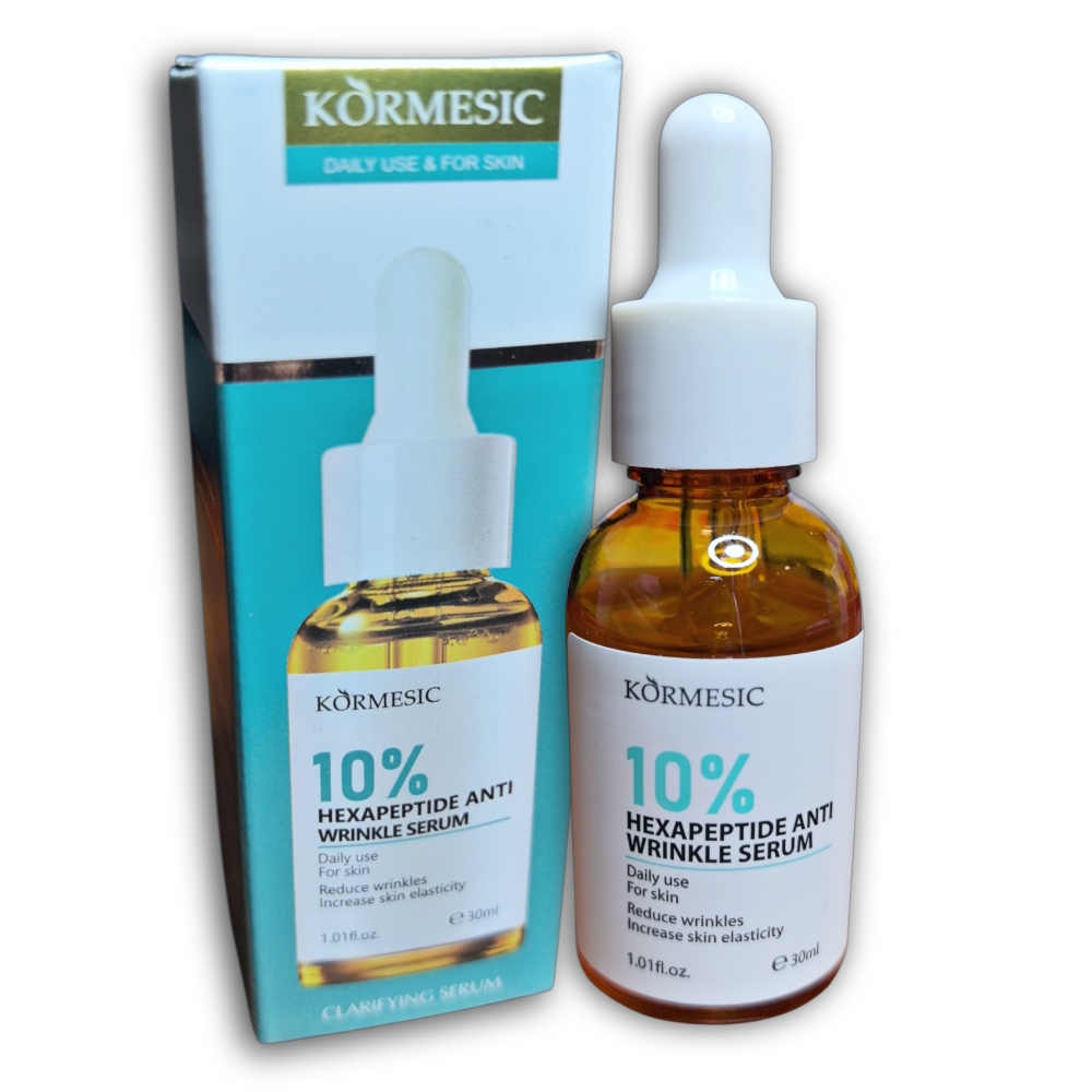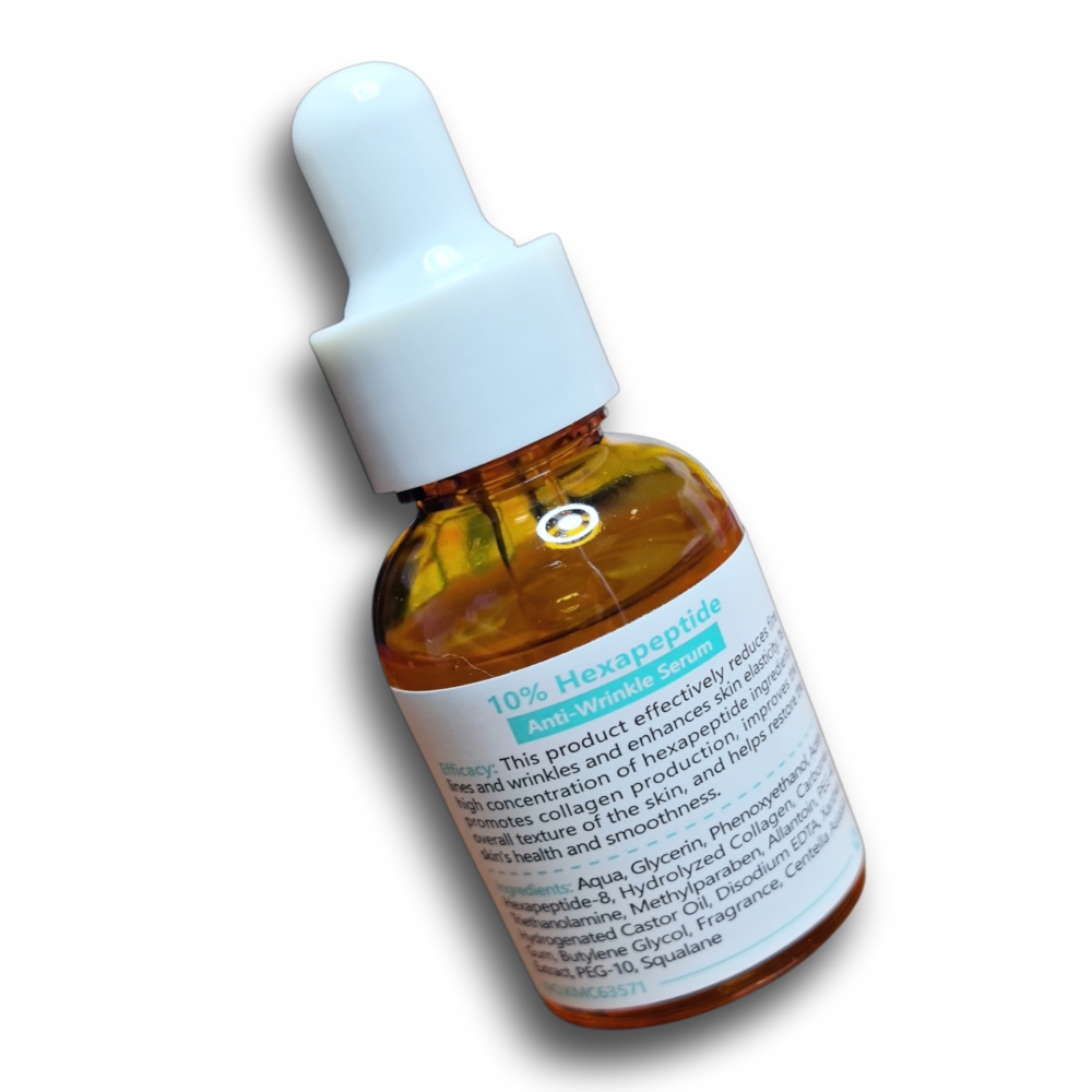 Suero antiarrugas hexapéptido 10% 30ml. Estimula la producción de colágeno y elastina, mejorando la firmeza y elasticidad de la piel, y aportando hidratación.