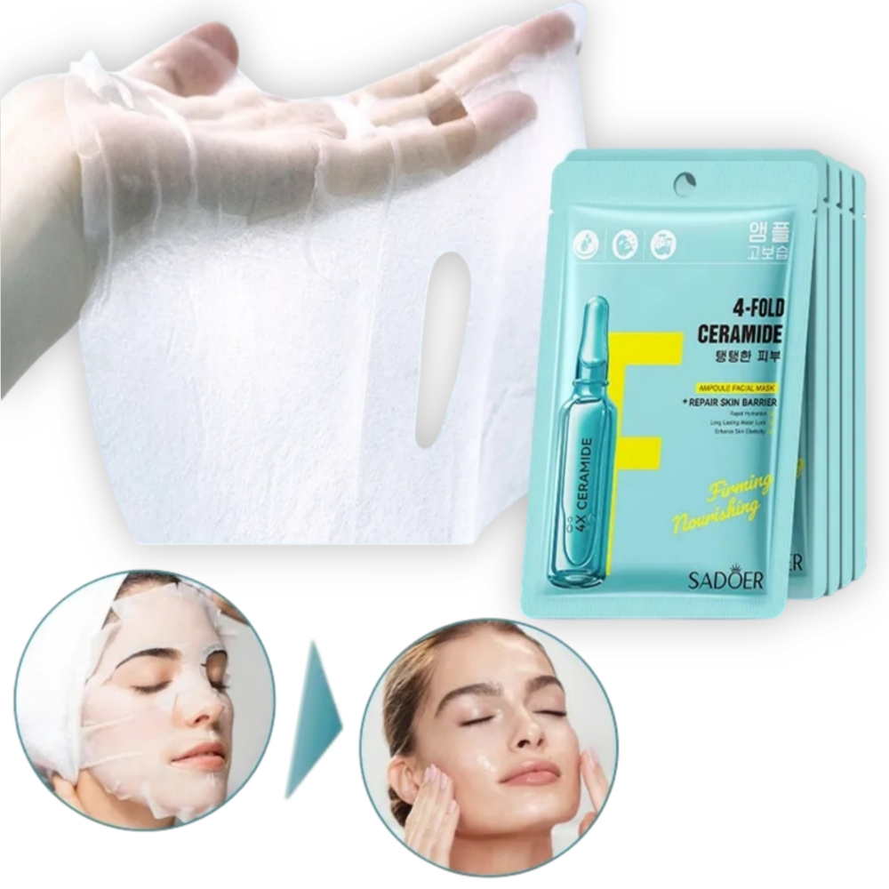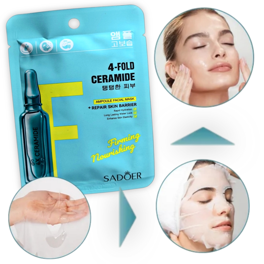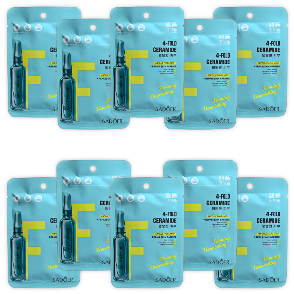Set de 10 mascarillas reparadoras con cuádruples ceramidas Sadoer. Está diseñada para proporcionar hidratación profunda, nutrición, y para reparar la barrera cutánea. Contiene ceramidas, que son eficaces para fortalecer la barrera natural de la piel. Mejora la elasticidad de la piel y la reafirma. Calma la piel y reduce la sensación de tirantez e incomodidad asociada con la piel seca.