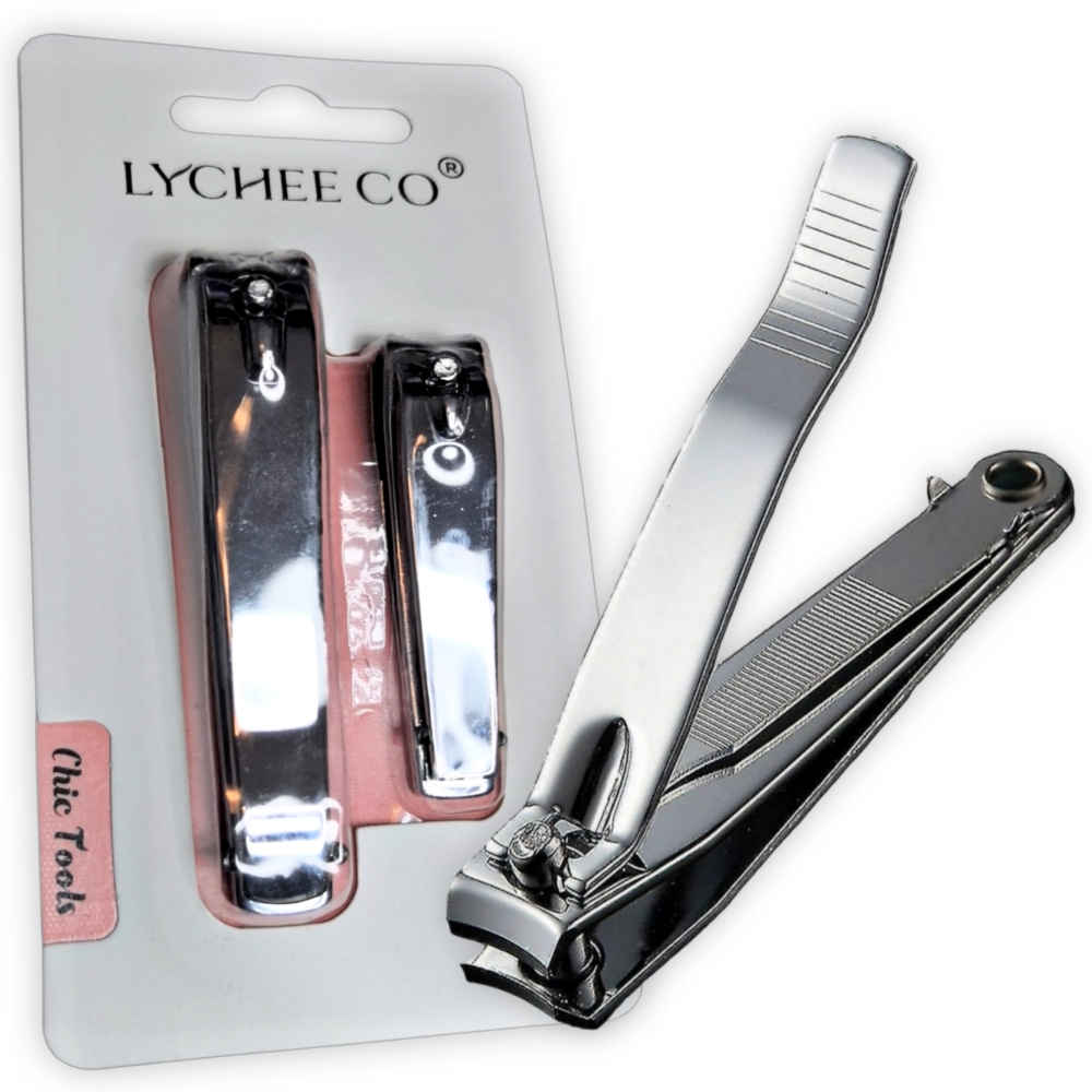 Un set que incluye dos cortaúñas de acero inoxidable, uno grande y uno pequeño, diseñados para el cuidado personal de manos y pies. El cortauñas más grande suele recomenderse para las uñas de los pies, mientras que el pequeño es ideal para las manos.