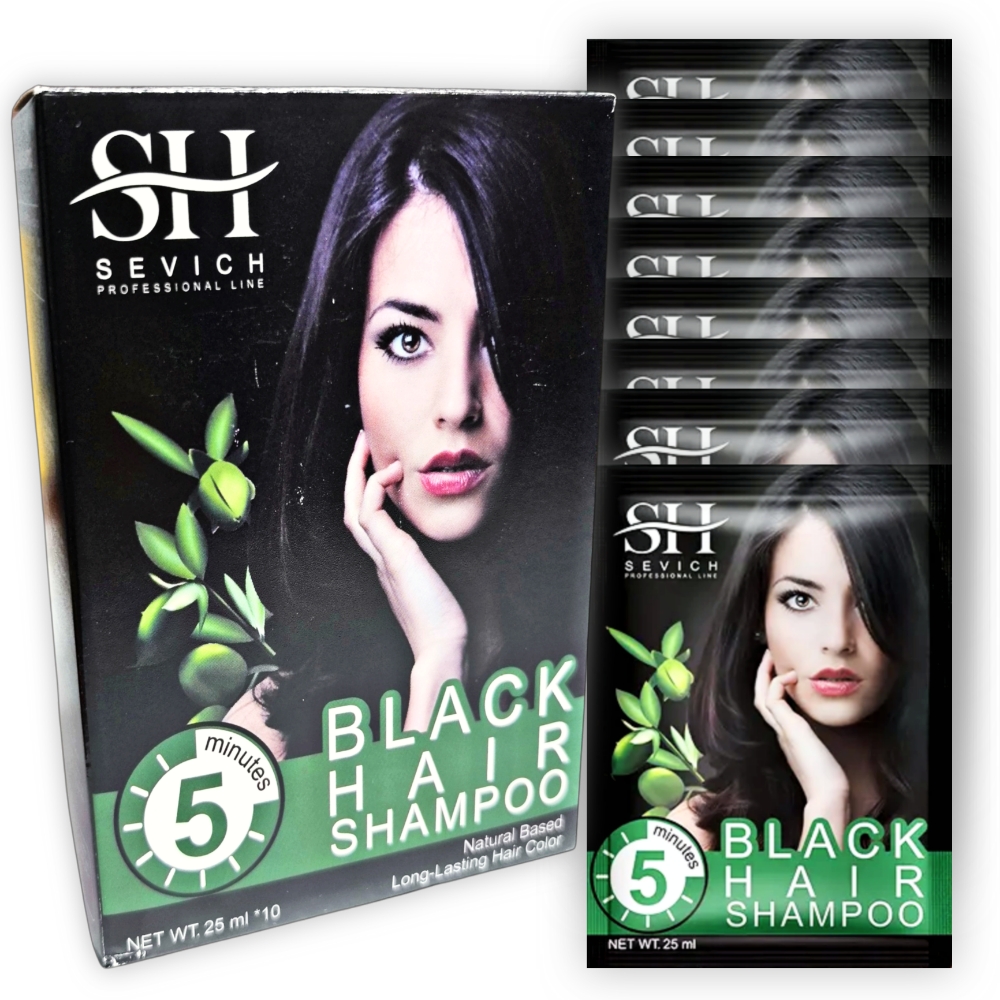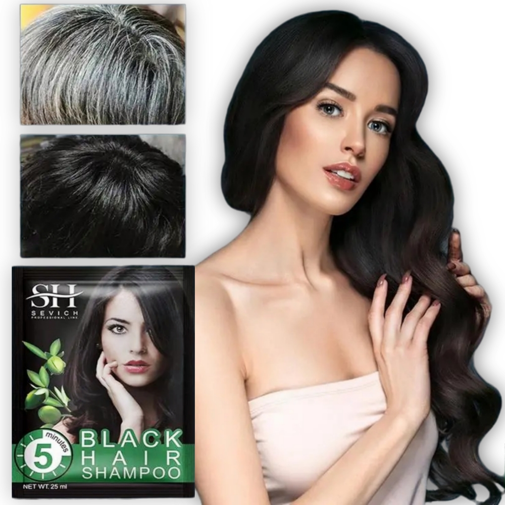 Un champú diseñado para teñir el cabello de negro de forma instantanea y cubrir las canas en tan solo 5 minutos, refuerza el tono negro del cabello de manera rápida. Modo de uso: 1. Se moja el cabello y retira el exceso de agua. 2. Se aplica el champú uniformemente sobre el cabello seco o húmedo y masajear. 3. Se deja actuar durante 5 minutos, luego se lava el cabello con abundante agua.
