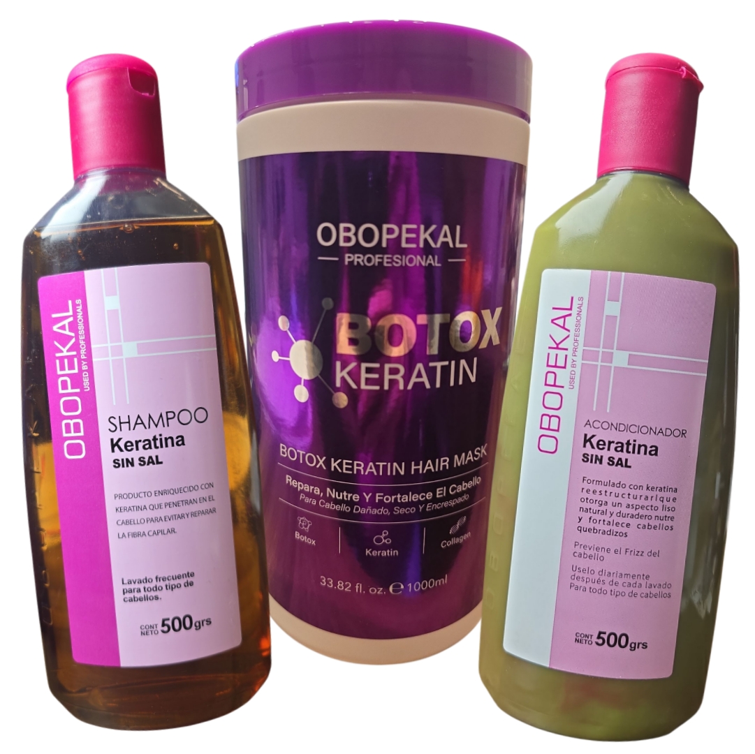 Shampoo y Acondicionador Sin sal de Keratina + Mascara Capilar Keratin Botox 1000 ml, Repara, nutre y fortalece el cabello.
