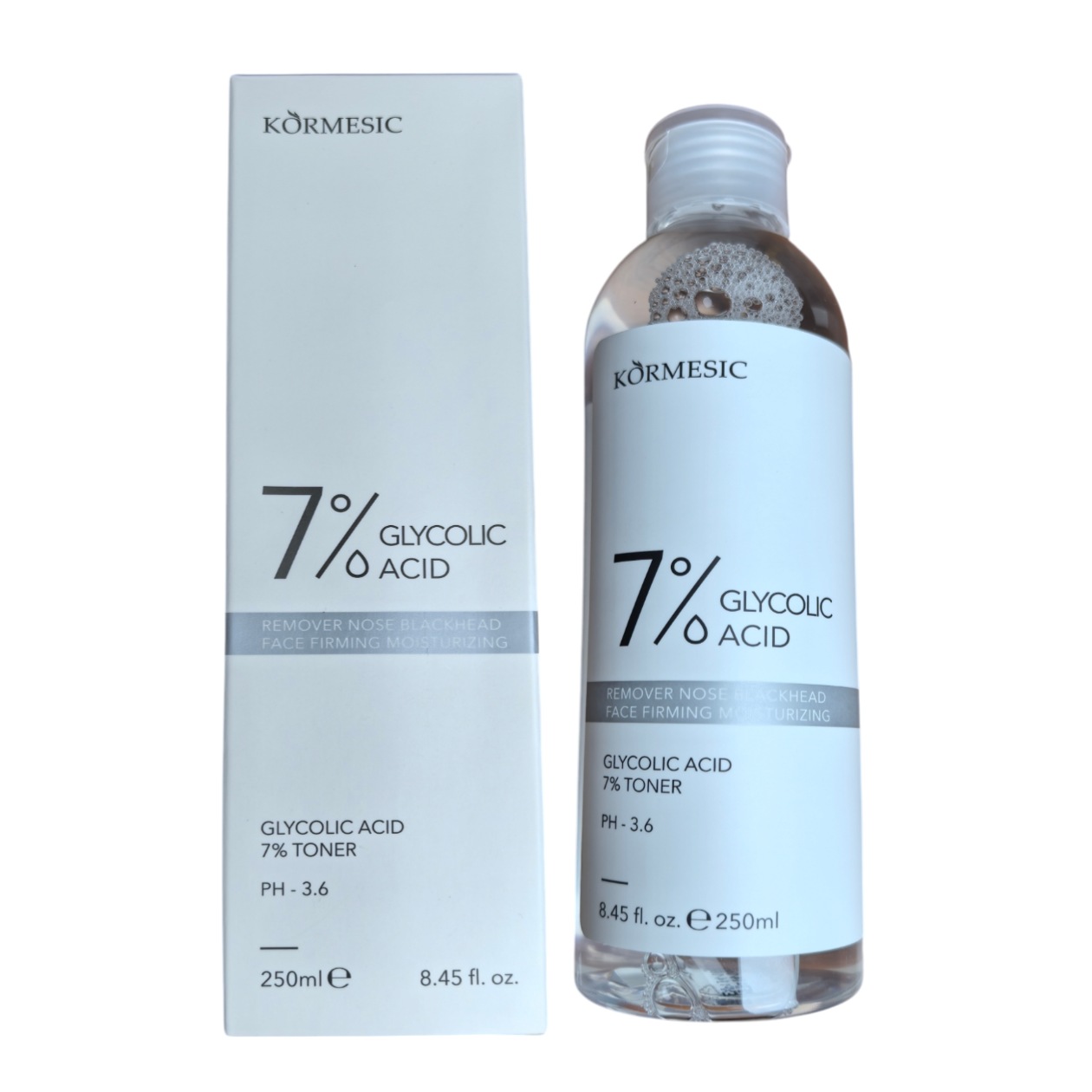Removedor de puntos negros con 7% de acído glicolico, PH 3.6, 250ml (8.45 fl. oz). Reduce el tamaño de los poros, controla la grasa, mejora la textura de la piel y la apariencia de manchas negras e hiperpigmentacion.
